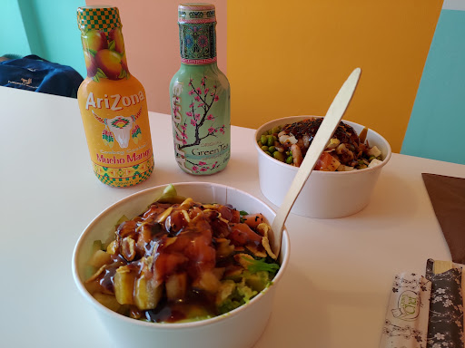 Bright counter-serve with limited seating prepping Hawaiian poke with rice, fish, veggies & fruit.