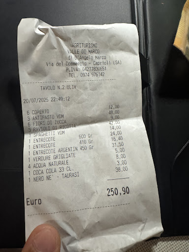 Read morePurtroppo un’esperienza deludente – peccato, perché il posto è carino||Premetto che non ho mai scritto una recensione negativa, ma questa volta ritengo sia giusto condividere la nostra esperienza, anche nella speranza che possa servire come spunto per migliorare.||Siamo stati ieri sera all’agriturismo Valle di Marco, 3 coppie di amici. Ci era stato descritto come un posto accogliente con una buona cucina, ma purtroppo le aspettative sono state completamente disattese.||Il contesto è effettivamente gradevole: il posto è carino e, nonostante il caldo, si stava bene. Purtroppo però, il servizio e la qualità dei piatti non sono stati all’altezza.||Il servizio ci è sembrato frettoloso e disorganizzato, nonostante fosse una tranquilla domenica sera con pochi clienti. Abbiamo ordinato l’antipasto “Valle di Marco”: solo i salumi erano discreti, il resto molto deludente.||Come primi abbiamo preso 3 piatti di ravioli alla ricotta (nel piatto c’erano davvero solo 3 ravioli a porzione…), uno spaghetto con alici e olive, e una fetta di carne. Dopo una giusta attesa, viene servita solo la carne, ma chi l’aveva ordinata ha aspettato gli altri per mangiare. Risultato? La carne si è freddata ed è diventata stopposa.||Abbiamo chiesto spiegazioni e la cameriera – che abbiamo capito essere anche la proprietaria – ci ha detto che i primi stavano ritardando a causa dello spaghetto. Poco dopo, arriva proprio lo spaghetto, ma non i ravioli. Ancora solleciti, ancora attesa. Alla fine, arrivano anche i ravioli: ripieno buono, ma salsa poco convincente, opinione condivisa da tutti.||Per secondo, ordiniamo 2 entrecôte da dividere in 4, fidandoci delle parole della titolare che ci assicura porzioni abbondanti. Purtroppo, arrivano completamente crude, nonostante avessimo chiesto una cottura media. Lo facciamo presente e, dopo circa 10 minuti, ci riportano un piatto rovente dove adagiare la carne… ma il calore eccessivo ha finito per bruciare immediatamente l’esterno, rendendola dura e immangiabile.||Facciamo notare il problema alla titolare, la quale – invece di scusarsi o cercare una soluzione – si giustifica a lungo, senza mai proporre un gesto di cortesia o un rimedio.||Al momento del conto, con grande amarezza, scopriamo che anche la fetta di carne completamente rifiutata è stata messa in conto, senza alcuna attenzione o riguardo verso il cliente. Un gesto che, sinceramente, ci ha lasciati ancora più delusi.||Dispiace davvero dover scrivere queste parole, perché il luogo ha potenziale. Ma quando mancano attenzione al cliente, organizzazione e cura nei piatti, non basta una bella location per parlare di...