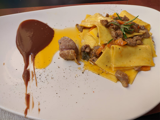 Io ho preso una rivisitazione di un piatto locale con l'anatra, "l'anatra in crescendo". Dei maccheroni spianati con ragù d'anatra e, a lato, del cioccolato fuso. Accostamento azzeccato e molto interessante. La mia compagna ha preso una tagliata di manzo, tenerissima e cotta molto bene. Come dolce abbiamo preso un tiramisù. Buono, ma per i miei personali gusti leggermente troppo spumoso. Gustosa la presenza di coccolato a pezzetti.