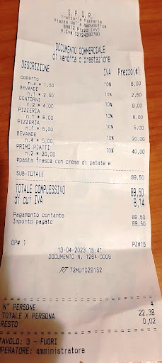 Worst experience in a restaurant in Italy so far! We ordered starters and pizza. The pizzas came while we were still eating the starters. We pointed to the waiter that we were not done with the appetizers and that if he left the pizzas at the table they would get cold. His answer was to push the plates from which we were eating the appetizers and leave the pizzas next to them. At this point, we had two options: eating cold pizza and enjoy the appetizers or leaving the appetizers on the table and eat the pizza. We called the owner of the restaurant to express our disappointment and frustration, she apologized but said that it was not a big deal, because we could eat the appetizers and the pizza together or eat the appetizers after finishing the pizza!!! I particularly cancelled my pizza and refused to pay the appetizers because the whole situation had ruined my appetite and had ruined a family dinner. She focused on the money and insinuated that we were complaining to avoid paying, saying “però voi avete già mangiato la metà degli antipasti. Io non mi arricchisco con 11 € di un antipasto”. In the end, everybody ate just half of the pizza (because of the bad mood we were in and because it was gummy and not well-cooked). The owner didn’t even have the decency to offer a digestive or a desert for their mistake or coming back and apologizing and seeing us off as I have generally seen in other restaurants when they receive a valid complain from a costumer. The owner was arrogant and unapologetic throughout the...