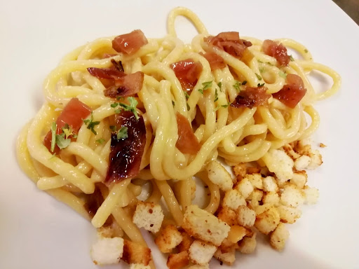 Una grande sorpresa. Domenica a pranzo, siamo in giro, è tardi, il bambino ha fame, capitiamo qui per caso. Il tempo di sederci e la gentilissima ragazza in sala gli aveva già servito una deliziosa mezza porzione di lasagne tiepide che lui ha spazzolato mentre noi sfogliavamo il menù con calma, e ascoltavamo i piatti del giorno. In 4 adulti abbiamo condiviso un antipasto misto con ottimi salumi, un formaggio particolare (credo fosse un goegonzola ma non era erborinato), una insalatina di radicchio, nocciole tostate e mirtilli disidratati, carciofini e porcini sott'olio. Ottimi anche i primi, con una menzione particolare per la carbonara, eseguita a regola d'arte. I dolci fatti in casa hanno messo una ciliegina sulla torta: è raro trovare una sacher fatta bene, ancor più raro se in monoporzione, e il semifreddo al mandorlato con salsa al radicchio è stato una piacevole scoperta "stagionale". Personale gentilissimo, locale semplice ed accogliente, servizi igienici puliti. Diciamo che dall'aspetto del locale non ci aspettavamo una qualità tanto elevata, e torneremo sicuramente per provare altri piatti e farlo...