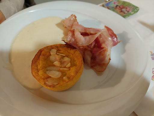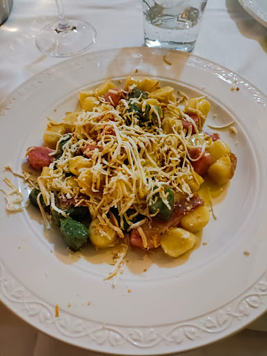 Entree con uno sformato di melanzane e formaggio in pasta kataifi, buono. Bis di primi: risotto di verdure ( a me sembravano le verdure congelate dei sacchetti del supermercato, tutto sommato non era da buttare) e pasta con limone e prosciutto crudo ( si sentiva solo il limone) Tagliata di manzo gratinata con olive su crema, ma non ho saputo di cosa fosse, forse un purè o forse una crema allo zabaione. Una buona carne non ha bisogno di altro se non un po di sale. Porchetta tagliata al coltello, buona. Contorni: patate ed erba cotta. A me non so piaciute molto. Torta buona, non so se fatta fare o di loro produzione. Forse un coltellino per tagliare la millefoglie avrebbe aiutato.