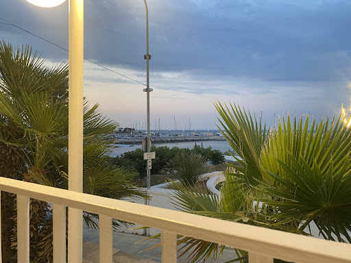 Una scalinata conduce alla terrazza: le barche a vela ormeggiate nel porticciolo, la brezza salmastra del crepuscolo e – di tanto in tanto – il rombo frivolo di una Ferrari, di una Lamborghini o di una Porsche, che entra o esce dal parcheggio poco distante. A qualcuno potrà sembrare un disturbo, io lo prendo come parte di quell’atmosfera da dolce vita adriatica.