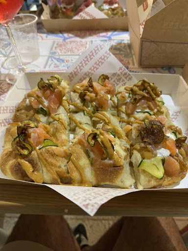 Loved having dinner here and really enjoyed the spianata with tartare (both tuna and salmon). It's in a lovely pedestrianised street of the city centre with a nice atmosphere and cute street lighting/decorations. There's only a few outdoor tables so I can imagine it becoming pretty busy over August, but there is a bigger air conditioned indoor room. Smaller menu selection than the original Pescaria but it had a much shorter queue on the night we went, and I personally prefer this location (vs busy square with cars...