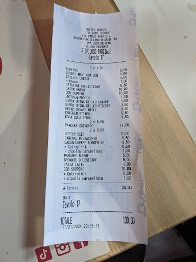 In foto scontrino di cena a 5 in cui abbiamo abbondantemente esagerato (4 antipasti, 5 panini, 6 dolci, 4 birre, aggiunte nei panini di ogni tipo, aggiunte nei dolci) insomma ci siamo andati giù pesante provando mezzo menù, se prendi panino + patatine te ne esci con 12€