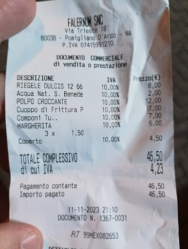 Ottimo cibo in ambiente pulito e confortevole e al giusto prezzo. Particolarmente apprezzabili gli impasti ed il pane fatto da loro, così come un memorabile panettone artigianale. Personale cordiale e disponibile. Ci tornerò per gustare le pizze e i calzoni. Aggiornamento marzo 2022 Mi ero ripromesso di tornare per assaggiare le pizze e così ho fatto. Abbiamo assaggiato diversi tipi di pizze e calzoni Dalla semplice marinara al più sofisticato calzone al soffritto con un ulteriore assaggio della tradizionale pizza fritta. In tutti i casi le pizze sono state davvero molto buone e si distinguono per un impasto particolarmente leggero. Abbiamo avuto modo di provare anche i dolci: una cheesecake molto fresca e davvero buona oltre ad un dolce al cioccolato al latte e riso soffiato che ha sorpreso molto positivamente i commensali. Abbiamo accompagnato le pizze con diverse varietà di birra. Mangiare al Falernum si conferma un'esperienza assolutamente piacevole e da ripetere, anche per merito di Gabriele che gestisce la sala con una disponibilità...