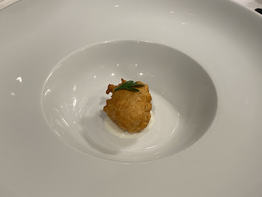 In addition to the complementary glass of sparking we were given a plate of bite sized breads, an amuse bouche of tuna croquet with white bean purée, and a pre-dessert of cream-filled beignets.