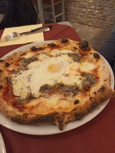Pizza tipo napoletana, su richiesta anche sottile, ricca in condimenti, molto buona e digeribile e lo dice una romana cui è arrivata una pizza all'amatriciana con la cipolla!!! Ahò, non ci va la cipolla sulla amatriciana 😂😂😂 però era buonissima uno dei migliori impasti mangiato da queste parti, oltre le pizze anche tanti altri piatti, e io ho preso un soufflé al cioccolato fatto da loro, molto molto buono. Pare che ci sia anche un giropizza interessante che andrà approfondito al più presto 👍 Ottima anche la Margherita col cornicione ripieno! Il locale è molto carino e pulitissimo, una delle pizzerie più lucide mai viste, personale...