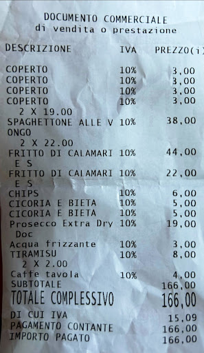 Read moreDunque, cominciamo col dire che il coperto a 3 € a persona per una tovaglietta di carta, tovagliolo di carta e le posate che ci sono state portate a tavola all’interno di un bicchiere in vetro e che ci siamo dovuti posizionare da soli sul tavolo direi che è un prezzo decisamente sproporzionato; la frittura a 22 €, una volta riversata sul piatto dall’involucro di carta con cui viene servita risulta essere decisamente scarsa, direi metà di una porzione normale sebbene di buona qualità… le chips di patata fritta nulla di che e comunque care, tiramisù minuscolo all’interno del solito vasetto otto euro e caffè a due euro l’uno?? Non mi sorprende fosse l’unico posto dove c’erano ancora tavoli in zona… Va bene che il momento è quello che è, ma approfittarne truffando letteralmente gli avventori...
