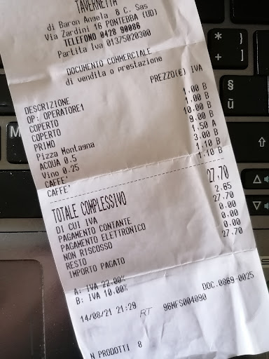 Il ristorante pizzeria Tavernetta si trova nel centro di pontebba, non ha un proprio parcheggio, ma in zona ci sono svariati luoghi dove cercare posto. Si trova sotto il ponte ferroviario. una volta entrati il personale è stato subito accogliente e cordiale e ci ha fatti accomodare in una parte esterna dove c'erano due tavolini molto intimi e riservati, abbiamo ordinato rispettivamente da bere, un primo ed una pizza. Tutto molto buono, il servizio è stato celere. The Tavernetta pizza restaurant is located in the center of pontebba, it does not have its own parking, but in the area there are several places to look for a place. It is located under the railway bridge. once inside the staff was immediately welcoming and friendly and made us sit in an external part where there were two very intimate and reserved tables, we ordered a drink, a first course and a pizza respectively. All very good, the...