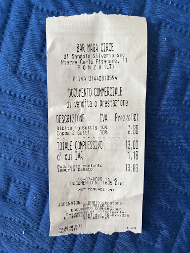 In due, per colazione, prendiamo un cappuccino, una fetta di ciambellone e un caffè shakerato. Qualità, a mio parere, nella media. Vado a pagare e il ragazzo in cassa chiede al suo collega il prezzo dello shakerato. Il collega mi guarda e gli risponde “7 euro”. Il ragazzo in cassa sgrana gli occhi e fa un’esclamazione di stupore, chiaramente sorpreso dal prezzo stellare - praticato nel posto dove lui stesso lavora - di una bevanda fatta con ghiaccio e caffè. Io, incredulo come lui, chiedo nuovamente il prezzo, che viene confermato senza batter ciglio. In pratica, il prezzo è stato scelto al momento del pagamento: individuati come turisti, siamo stati trattati come vacche da mungere. Durante la nostra permanenza a Ponza, abbiamo incontrato ristoratori onesti e professionali. A causa dell’esperienza in questo bar, tuttavia, il nostro ricordo dell’isola sarà un po’...