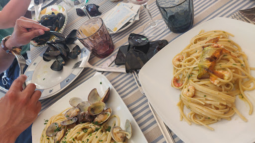 Piatti: il sugo di ricciola era buono, ma la cosa che mi ha colpito di più è stata la tagliatella col ragù di polpo. Superlativo è dir poco. Per quando riguarda il fritto era leggero e non era unto. Abbiamo apprezzato i gamberetti interi e i pesciolini nel fritto ci ricorda il fritto di paranza di casa. Ed infine ci hanno portato come pesce del giorno un Occhione pesce conosciuto come pezzogna dai locali. A prima vista aveva molto olio ma devo dire che era ricco di profumi di mare e fare la scarpetta col pane era come un rito di passaggio del piatto. Per digerire non avevano il sorbetto vero e proprio ma una coppa di gelato al limone che ho anche apprezzato di più del classico sorbetto.