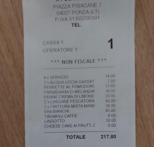 Read moreWe were just in Ponza for the day and after sightseeing & swimming we were ready for lunch! After strolling down the line of restaurants looking at menus we came to the end. As we were studying the menu, the waiter greeted us and asked if he could help with the translation. Although his English wasn’t perfect, it was better than our Italian (which is none), he explained every item. Our choice was made not because of that menu selection but because of the genuine hospitality he had shown to us. We had a seat under their covered patio ordered a bottle of Prosecco and placed our food order. We got the mussels, the fried squid& shrimp, eggplant Parmesan, linguini w/clams and a large salad. All of the food was delicious! Our favorite was the linguini…we’ll be talking about it for a while! We highly recommend this little restaurant with the friendly staff and...