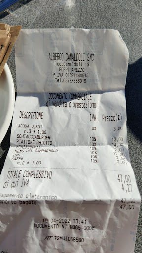 Read moreLa fama si sa, non porta sempre benevoli risultati. Essendo stato con la famiglia a raccogliere le castagne nel bellissimo castagneto demaniale di Camaldoli, abbiamo deciso di fermarci a mangiare la famosa schiacciata omonima nello storico ristorante di questa incantevole località. Purtroppo la sorpresa è stata spiacevole, la schiacciata che abbiamo mangiato non solo non era fresca, potrebbe essere stato accettabile qualora ci fosse stato un grande afflusso di persone ma eravamo forse in 7/8 non di più, ma è stata scaldata male, gommosa al palato pesante alla digestione, insomma una vera e propria delusione. Peccato perchè devo ammettere che invece gli ingredienti della farcitura sono sembrati a tutti noi di buona qualità. Però dato anche il costo elevato, il gioco non vale la candela. Sarebbe stato da una sola stella ma degli ottimi biscottini che abbiamo comprato (e pagato a peso d'oro) mi hanno convinto ad essere un po' più...
