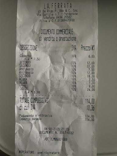 Read morePremessa: questa è la mia prima recensione. Sebbene in tanti anni di lavoro ho alloggiato in tanti hotel e mangiato in tanti ristoranti ed osterie, non avevo mai avvertito alcuna esigenza personale di catalogare e comunicare le mie sensazioni su queste esperienze. Peccato perché, non avendolo fatto, ho perso un po' dei miei ricordi e del mio vissuto. Qualcosa però è recentemente cambiato. Forse anche grazie alle emozioni di una cena in centro a Pordenone. E allora oggi, A.D. 2022, inizio a fare il (re)censore da l' "Osteria La Ferrata", un'Osteria con la "O" maiuscola proprio in pieno centro a Pordenone. Personale che sa accogliere, piatti della tradizione con una rivisitazione smart ma certamente non invasiva. Accurata scelta di vini, anche al bicchiere. Prezzo: 25 euro a testa. La tanta gente seduta ai tavoli, e quella che non ha potuto sedersi perché senza prenotazione, certifica la qualità del locale. Non ho dubbi: un gran bel...