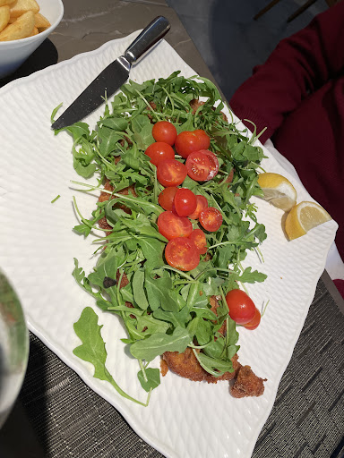 the dinner was delicious. When we arrived we were served with a bowl of fresh salad, some chickpeas and bread. Just look at the size of schnitzel ( the knife on a plate is for comparison). The pasta with fish and aubergines was very good. The lemon pie - sooo delicious and perfect taste balance of sweet and sour flavors. The staff is super nice and polite. And just the whole atmosphere...