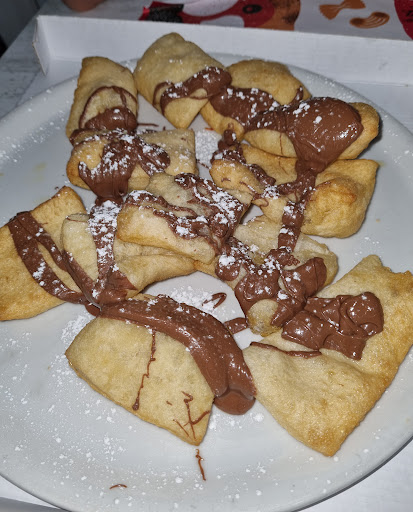 Prenotato su TheFork con una promo del 50% ci siamo ritrovati a lasciare il locale senza concludere la cena. I prezzi del menu sono raddoppiati rispetto a quelli da asporto. Una porzione di patatine con salsiccia e fonduta viene venduta a 12€. Le zeppoline prese erano crude, le abbiamo rimandate in cucina e sono ritornate dopo poco (supponiamo fossero delle altre) ancora più crude delle precedenti. La porzione di patatine, würstel e fonduta, sebbene apparentemente abbondante, era composta da 2 sottilette sciolte sul fondo del piatto su cui erano riversate delle patatine industriali e due würstel tagliati così finemente da risultare più orosolubili di un’ostia. Dopo poco sono arrivate anche le pizze, già visivamente piuttosto deludenti, al taglio il cornicione risultava ancora crudo e mangiandone alcuni pezzi è stato subito palese che gli affettati (prosciutto di una e salame della altra) erano maleodoranti, secchi e con un gusto sgradevole, chiaro segno che non fossero né freschi né di qualità. Il tutto condito da una smodata quantità di olio di semi ( olio motore?!?). Abbiamo lasciato il ristorante di corsa. Non ci ritorneremo in questo angusto refettorio (perché si, la sala è un quadrato di 3x3 in cui sono ammassati un angolo caffè in disuso, documenti fiscali della pizzeria, un mobile di una cucina raccattato di sera per strada, delle decorazioni appese che Barbara guglienetti in persona non sarebbe in grado di riciclare a PaintYourLife.. per non parlare della rivisitazione dell’ultima cena con i personaggi più illustri di Napoli con una Sofia Loren improvvisamente trasformata in un alieno rettiliano) , neanche se ci pagassero varrebbe la pena subire una tale...
