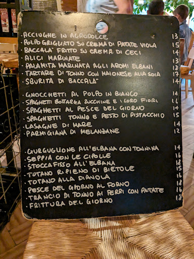 Read morePremetto che vivo in un ristorante da oltre 50anni ed alcune dinamiche le colgo al volo....e sono capitato x cena a Porto Azzurro. L'aspetto totalmente turistico dei locali non mi convinceva ma ho lasciato fare a mia moglie che aveva trovato questa locanda più accogliente delle altre. Ci accomodiamo e ci viene dato l'originale menù su lavagna appoggiata su di una sedia. 7 antipasti, 6 primi ed 8 secondi. Poi lista vini/birre (stampate su busta da lettera, originale). Impieghiamo qualche minuto x decidere ma attendiamo di poter parlare con qualcuno per chiedere cosa fossero "sburita" "gurguglione" e "tonnina". Finalmente ci riusciamo con la ragazza che doveva prendere l'ordinazione che dopo la spiegazione però non ci perdona i pochi attimi di tentennamento ed invece di consigliarci ci pianta in asso perché indaffarata (e spazientita). "Torno dopo". Finalmente ordiniamo: gnocchi al polpo e viriamo subito su spaghetti al tonno e pistacchio perché la richiesta sugli spaghetti al pesce del giorno viene subito cassata con una smorfia. Per secondo del totano ripieno di bietole. Contorni non erano segnati e non abbiamo chiesto oltre perché la ragazza andava di fretta. Poi le bibite. Costretto a bere solo acqua perché erano segnate solo bottiglie di vino intere e due birre artigianali (33cl 7€ e 50 cl 9€) che forse non si addicevano alle pietanze di pesce (a meno che il cameriere non le avesse consigliate specificatamente). Osavo chiedere del vino sfuso ma con già la ragazza in fuga ne sentivo solo l'eco (...non ne abbiamo). Cioè io vengo da Portoferraio in motorino e o mi bevo una bottiglia di vino da solo -moglie astemia- (e torno in taxi) o nulla. Mai accaduto il non poter bere un semplice bicchiere di vino -che peraltro è molto più redditizio- (a meno che la ragazza in questione non conoscesse la parola "sfuso"). Dopo tale smacco e con una cena di pesce, con acqua, volevo andare via e bloccare l'ordinazione ma mia moglie non ha voluto. I piatti erano cucinati bene e saporiti e tanto di cappello allo chef ma quando tutto il lavoro e l'arte della cucina viene vanificato da camerieri stanchi che ti trattano come un numero, pressandoti invece di consigliarti, sembra più di stare in un ufficio postale che non in una rinomata località turistica. Tanto per uno che va via ne entreranno altri dieci... Ad ognuno la sua politica, per l'amor di Dio, ma di tanti viaggi spesso ci si dimentica dei luoghi e ci si ricorda quel locale o quella specialità... Il conto è in linea coi prezzi dell'isola anche se....coperto 2€ (tovagliette di carta) che non era segnato sul menù (e che per legge avrei potuto non pagare). Vabbè.....tanto al posto mio ne arriveranno altri...