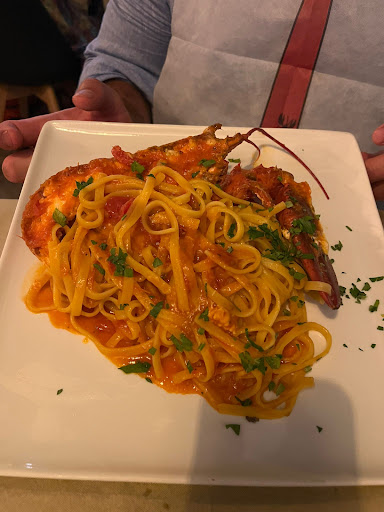 I ordered pasta with lobster, but it was just plain pomodoro pasta with half a lobster on top, small portion, no seafood flavor at all — a total disappointment for 25 euros. My wife’s spaghetti alle vongole tasted like plain pasta aglio e olio with clams that had no flavor.