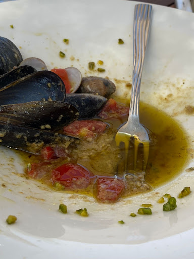 Ho preso un’insalata di mare come antipasto che era letteralmente congelata e totalmente insapore per poi passare allo spaghetto alle cozze, molto sciapo (abbiamo dovuto aggiungere sale 😅) e c’erano solo 6/7 cozze per un quantitativo esagerato di pasta (terminate quelle poche cozze, sembrava pasta in bianco in quanto non era stata nemmeno ben amalgamata).