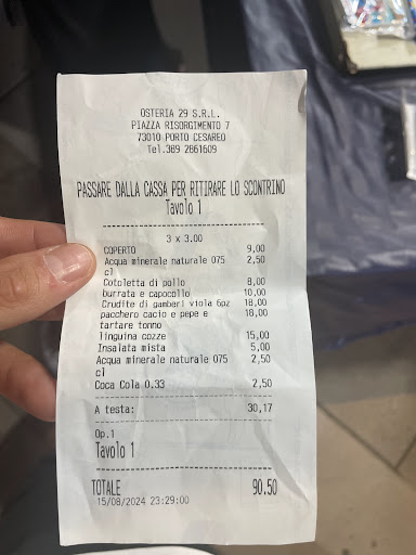 Read morePrenotando mi viene detto che Osteria 29 e Ristorantino del Corso "sono la stessa cosa", questa frase tornerà più volte nella serata. Invito Gambero Rosso che il 09/07/24 ha segnalato Osteria 29 a fare un nuovo passaggio senza preavviso per valutare la nuova gestione e qualità. La recensione si riferisce quindi al "Ristorantino del Corso" di Porto Cesareo. Ordiniamo due primi: Spaghettone alle vongole veraci e bottarga + Scialatielli alla pescatora + 1 bottiglia piccola di vino rosé. Nello spaghettone è stata dimenticata la bottarga (assolutamente non presente), il piatto di scialatielli è stato avanzato per più di metà per via del sugo acido e assenza di pesce indicato in menù (perché definirlo alla pescatora?) oltre il sugo infatti erano presenti 2 cozze di numero senza guscio e solo calamari. Sul vino si apre un capitolo mai vissuto nella ristorazione: ordiniamo una bottiglia piccola di Tormaresca Calafuria Rosé, la responsabile ci invita prendere il Cantalupi Rosé perché "è la stessa cosa", noi rifiutiamo la proposta (conoscendo il vino) e ribadiamo la scelta. Arriva il cameriere e ci porta, già aperto, il vino Cantalupi Rosé, noi ribadiamo che non avevamo scelto quel vino ma la risposta è stata (testuali parole) "si fidi è la stessa cosa se non migliore, è il nostro vino questo", il vino viene lasciato al tavolo, con glacette e scottex (si scottex) intorno al collo della bottiglia (vedere foto). Il cameriere corre a servire altri tavoli. Poco dopo arriva un'altra cameriera portando un contenitore tristissimo con pane e taralli (vedere foto). Cena durata 20 minuti netti, al momenti di pagare il conto spiego tutto alla responsabile che mi dice semplicemente un "riferirò", forse non è usanza in questo locale ma almeno come gesto un ristoratore (vedendo i piatti tornare indietro) offre uno sconto o un amaro ... almeno il gesto. Esperienza imbarazzante e pessima sia per la qualità del cibo che per il livello del servizio. Prezzo per 1 acqua + mezza bottiglia di vino + due primi, ben...