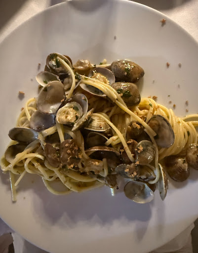 Read moreOttimo ristorante di pesce, che serve piatti ben cucinati con freschissimo pescato del giorno: abbiamo molto apprezzato l'antipasto con crudi e cotti di mare. La nostra esperienza è, complessivamente, positiva. Le porzioni sono piuttosto abbondanti (consigliamo di prendere un solo piatto tra primo e secondo e dividere un antipasto ogni due persone); c'è una grande cura dei dettagli, come ottimi pani e grissini d'accompagnamento col coperto; la carta dei vini è essenziale ma soddisfacente, e le porzioni di vino al calice sono estremamente generose. Un unico imprevisto: la mancanza delle cozze e della bottarga. È normale che a fine giornata parte del pescato finisca, e si sia costretti a scegliere altri piatti. Tuttavia, ci saremmo aspettati una revisione nel prezzo degli spaghetti alle vongole e bottarga, divenuti semplicemente alle vongole, che pur impoveriti sono rimasti il primo più...