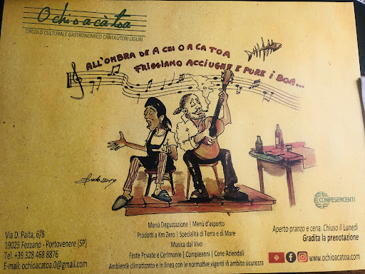 Una meravigliosa giornata passata a visitare le 5 terre non poteva che concludersi con una cena a dir poco strepitosa. CI siamo messi a sedere a ci siamo lasciati coccolare da una degustazione di 12 portate giusta nelle quantità e nei sapori. Alcuni piatti ci sono rimasti impressi: il "panino" con i muscoli (retaggio della nonna di Cristiano -il titolare-), le lasagne di mare con 3 tipi di pesce (delicatissima e piena di gusto), il filetto d'orata al prosecco, il crostino di pesce leggermente piccante. I bambini hanno adorato il muscolo fritto e la polpettina di muscolo...per non dire degli spaghetti con le vongole , olive taggiasce, pinoli ecc..... Per i nostri bambini avevamo anche concordato tagliolini al ragu' che hanno letteralmente divorato con tanto di scarpetta! A questo proposito un particolare ringraziamento a Chiara (livornese verace :-D ) che ha capito l'esigenza di una famiglia con bambini, preparandoci un'alternativa per i più piccoli. Questo perché ci siamo sentiti il giorno prima per la prenotazione ed ha avuto la sensibilità proprio di chiederci questo. La location è caratteristica: a cena nella piazza con tutti i palazzi del carugio incorniciati da una illuminazione caratteristica. Ci è mancato ascoltare la musica di Cristiano e Chiara, eravamo curiosi perché avevamo notato che Cristiano è stato vincitore per premio Tenco nel 2011. Purtroppo in un altro ristorante non molto lontano c'era un altro artista con amplificatore... beh sarà per la prossima volta. CI vediamo a fine estate!! Grazie Chiara e Cristiano, ci avete fatto chiudere la giornata in bellezza!! Il prezzo? Più che adeguato e secondo gli accordi. 35€ per una degustazione di 12 portate!! Vino, acqua, caffè e...