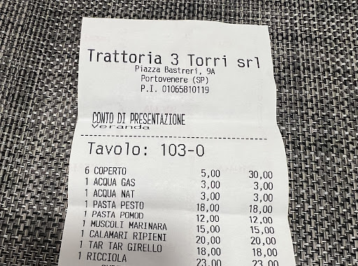 The Google Maps english 2023/02 information describes Tre Torri as 'down home' cooking-that is incorrect. I believe it is an attempt at finer dining as noted by the prices. We took lunch there and ordered the risotto which was priced at €25. It was explained the risotto was for minimum 2 persons and that was ok. As it turns out we paid €50 for two plates of risotto. Perhaps it is our misunderstanding but we would never pay €50 for two plates for rice if it had been explained clearly. "25€ per person" or " per portion" would make it clear. The risotto was with pear and walnut and was very if not too sweet for a first plate with a garnish of crushed walnuts and sugar. The San Pietro ( tilapia) fish at 25€ was very good. We consumed 3 glasses of wine and were billed for 4, until it was explained that we did not have 4 and they...