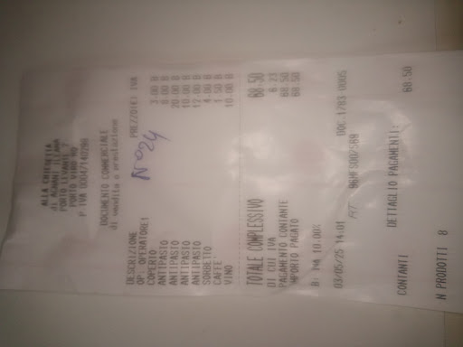 Read moreBuongiorno a tutti ...dopo una sgroppata di circa 170 km in moto lungo l'argine del Po' arrivo a Porto Levante e prenoto in questo ristorante. Ora, gentilissimi e un personale di servizio impeccabile ma...la sorpresa la trovo al momento del conto, allego le foto di quello che ho consumato e lo scontrino di quello che ho pagato. Mi hanno accontentato : le cozze non erano in menu' servite in una terrina (credo doppia porzione) scaldate e raggrinzite, poi l'antipasto (vedi foto..) un litro di vino alla spina un caffe.... amici miei : EVITATE, SE POTETE !