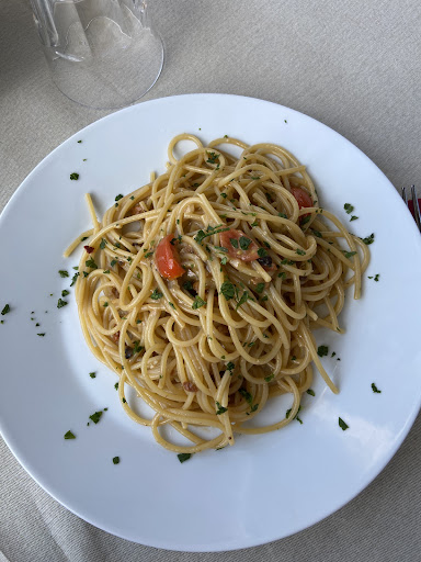 L’antipasto (seppie con bietola), suggerito dal proprietario, si è rivelato un assaggio misero, praticamente due cucchiai. In generale le porzioni sono davvero scarse: i tagliolini al riccio erano una pasta buona ma coperta da aglio e peperoncino, con il riccio quasi impercettibile. Gli gnocchetti alla cernia erano in realtà le classiche chicche confezionate, pesanti e farinose, con un sughetto unto e amarognolo. Pane secco e molle. Dolci poco invitanti (sorbetto, tortino al cioccolato e mattonella con frutta), quindi abbiamo rinunciato.