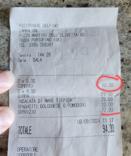 Read moreBEWARE. The price is going to be more than you think from the menu. We were resigned to paying for the convenience of a table. Most places had no empty tables. However, we were unpleasantly shocked by the addition of the 10 euro Cover Charge and the 12,30 euro Service Fee. We expected to pay 20 euros for a plate of spaghetti bolognese and 25 euros for the insalada di Mar along with 9 euros each for the 3 beers. First, the waiter brought us a 150 euros bill containing items we never ordered. It was not ours. He then passed that bill to the next table. I hope it was truly their bill. When he brought our correct bill, instead of the 72 euros we expected based on the prices listed in the menu, it was 94,30 euros ($105.20 US!l per my card statement !!). We had to ask for the bread after our meal arrived and for the parmesan cheese for the spaghetti. Little things, but at that price, you expect not to be the one asking for proper service. If you go to Portofino, pack a lunch, or get something at the small local mraket, don't expect to sit for a meal. All that being said, the food was tasty, and the service ok, but nowhere near the cost. We have had many good meals in Italy that made us very happy, not here. Sorry, there is no photo of the food. We were not expecting to need them. (edit addition: we came across 4 euro cover charges in more modest restaurants around Italy. Most had no such charge. But the service charge was unique. All in all, we didn't get our...