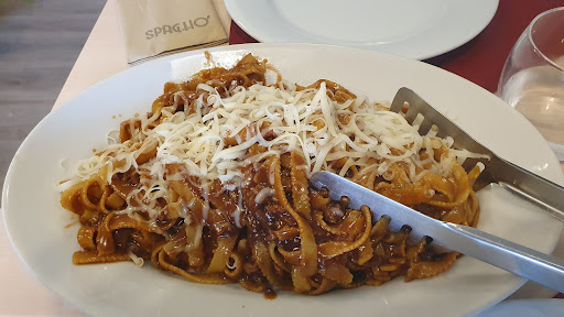Read moreLo metterò nel vorrei ma non posso. Allora il servizio ottimo, le ragazze veramente disponibili e professionali, in due abbiamo ordinato : verdure alla griglia, buone e saporite, acqua e 1/2 litro di bianco freschi. Il primo pennette alla Carnaccina ( un classico delle spaghetterie così diciamo che non puoi sbagliare) essendo la prima volta volevo andare sul sicuro. E qui iniziano le perplessità, la pancetta era poco cotta, e quindi non croccante ma al contrario piuttosto molliccia, poca panna e quindi il piatto parecchio asciutto ma fin qui, posso anche capire.. ma La pasta era a dir poco scotta. Io direi di assaggiarla prima di farla uscire, 5 secondi di attenzione valgono l’attesa del cliente ( mangiata per fame visto che dovevano rientrare a lavoro ) e sono sincero le ragazze dopo averglielo fatto notare, hanno proposto di rifarla, ma ormai avevamo mangiato. Anche la qualità della pasta secondo me non era il massimo, forse dovrebbero valutare altri fornitori. Un dolce della casa buono, e il conto di 43€? Se avessimo mangiato bene era assolutamente giusto ! In conclusione ? Pietanze sicuramente abbondanti, ma io avrei proposto, essendo una spaghetteria che si chiama spaghò, un menù più snello, magari migliorando proprio i primi, che poi è il motivo per cui uno va lì e non in ristorante. Spero che la critica sia uno spunto per i gestori a migliorare non il servizio, ottimo ma l’attenzione ai primi...