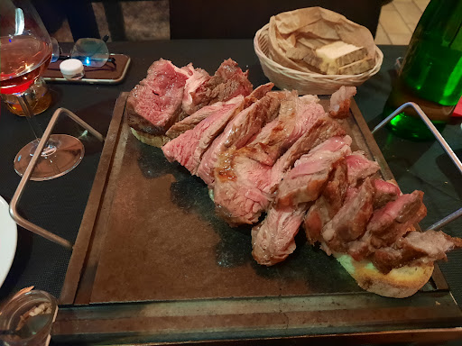 Ottima cena Sono stato a cena in questo locale con degli amici. Il locale si presenta molto carino già all'ingresso. Non ci sono molti posti a sedere ma è un fattore positivo, in quanto l'unico cameriere di sala può così dedicarsi al meglio ai clienti. Il tavolo è ben apparecchiato. Abbiamo ordinato poco dopo esserci accomodati. L'antipasto è arrivato quasi subito, un'ottima tartare di manzo con uovo e tartufo, servita con del pane per poterla "spalmare" sopra. L'altro antipasto era un provolone con miele e tartufo accompagnato anche questo con del pane. In 3 abbiamo ordinato una fiorentina. Il cameriere dopo aver "attrezzato" un banchetto di fianco al nostro tavolo, ha iniziato a tagliare la fiorentina con grande maestria. La cottura era ottima. Il cameriere ci ha consigliato di condirla con dell'olio e del sale affumicato oppure sale rosso. Una particolare attenzione è stata quella di posizionare delle fette di pane sulla pietra lavica prima di appoggiare su la carne, in modo da mantenerla calda ma non farla continuare a cuocere. Insieme alla carne ci è stata servita dell'insalata di mele, molto semplice ma buona e fresca. Infine abbiamo ordinato della panna cotta con vino e cannella. Davvero una cena soddisfacente. Compreso acqua e bevande, il costo è stato del...