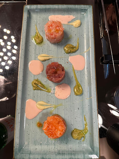 Sabato scorso, io e la mia ragazza abbiamo deciso di concederci una serata speciale al ristorante di pesce "30 passi d'acqua", e posso dire con certezza che è stata una delle migliori decisioni gastronomiche che abbiamo mai preso. Appena arrivati, siamo stati accolti da un personale sorridente e molto cortese, che ci ha fatto sentire subito a nostro agio. L'atmosfera del locale è davvero incantevole: elegante ma non pretenziosa, con un arredamento moderno che richiama il mare in modo raffinato e suggestivo. Il menÚ è una vera e propria ode alla freschezza del mare. Abbiamo iniziato con un antipasto misto di mare che ci ha lasciato senza parole. Come primo, abbiamo scelto gli gnocchetti con frutti di mare e crostacei, un piatto ricco di sapori deliziosi e perfettamente equilibrati, con ogni ingrediente che risaltava per freschezza e qualità . Per il secondo, ci siamo lasciati tentare dal tataki di tonno. Una scelta azzeccatissima: il tonno era di una tenerezza incredibile e il sapore raffinato, accompagnato da una salsa leggera che ne esaltava ulteriormente il gusto. Per chiudere in bellezza, abbiamo condiviso un dessert tipico della casa: un bignè con crema pasticciera che era leggera e deliziosa. La carta dei vini offre una selezione ben curata di etichette locali e internazionali, e il personale è stato molto competente nel consigliarci l'abbinamento perfetto per ogni piatto.