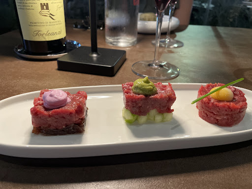 Read moreBuona ristorazione, qualità materie prime e ottima preparazione delle portate proposte. Ho gradito molto il tris di tartare di fassona con abbinamenti proposti, in particolare uovo di quaglia. Buono anche il gateau di patate caldo e delicato con fonduta di pecorino, e le zucchine a scapece e anche i broccoletti. Per carne hanno varie proposte sia nazionali che internazionali, abbiamo optato per una entrecote argentina, molto buona. Per carta vini ottima selezione, abbiamo ordinato un primitivo di manduria dop pugliese buonissimo. Per dessert buoni, ottimo anche un whisky americano di buon malto. Personale cordiale e gentile, ottimo servizio. Prezzi nella media. Locale in posizione centrale Pozzuoli facilmente raggiungibile da tangenziale uscita Arco Felice. Sala moderna, ottima musica di sottofondo, sala interna con banco carni e sala esterna con vari tavoli e ampie vetrate, ma avrei gradito maggiore privacy, per vista strada auto e persone, ideale un tendaggio leggero per riparare da occhi indiscreti. Lo consiglio per amanti del buon...