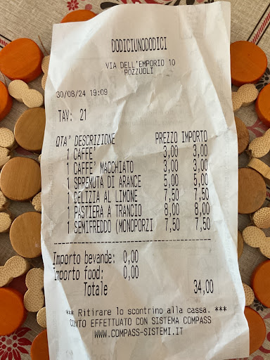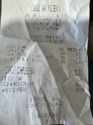 We hebben hier de meest opmerkelijke ervaring in heel Italie opgedaan. Ik bestelde twee espresso macchiato, €1,40 per stuk, prima prijs. Ik moest de bon aan de dame bij de koffiemachine geven en kreeg toen de koffie. De koffie was ook gewoon prima. Nietsvermoedend gingen we op het terras zitten waarna we tot onze grote verbazing nog een extra factuur kregen van €4. 2x coperto van €2. Wij hadden uiteindelijk nog geen 3 minuten op het terras gezeten en de koffie ook nog eens zelf aan de bar gehaald. We probeerden het wel maar konden er helaas niks tegen inbrengen. Uiteindelijk werden we te woord gestaan door een lieve en goed Engels sprekende dame. Nog wel complimenten voor hoe zij dit probeerde op te lossen.