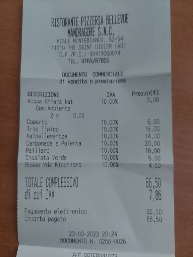 All the prices were listed on the menu but the biggest surprise was when the dishes came: an extreamly simple salad with old lettuce from a bag, literrally. We could not eat half of it because it was going bad. rustic gratin which was suposed to be made of multiple vegetables and some gilled cheese on top. Actually, a bunch of sliced potatoes dipped in melted cheese, so salty and thick that it was a pain to eat. and some meat 'alla valdostana' which was some simply grilled steak, pooly cooked, with a slice of ham and cheese on top. second rate heady wine (come on it's Italy!!!) priced as high class and an expensive cover for a non-existing friendly service.
