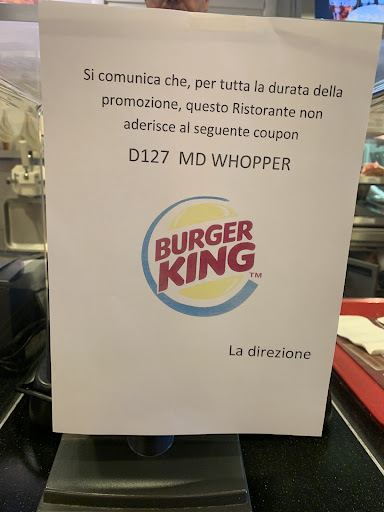 Read moreVengo spesso in questo birger king in quanto è quello più vicino casa mia. Purtroppo devo ammettere che si va man mano peggiorando... Questa sera addirittura mi è stato dato un sundae mini al posto di un sundae normale (voglio precisare che ho pagato quello grande con la promozione AP018 a 1.30) ma non è finita qui, ho ordinato 2 chilly da 6 e mi sono state date in un sacchetto 6 chilly e in un altro 4 chilly e 2 onion.. ora se volevo le onion le avrei comprate visto che clstano anche meno, se non avete il prodotto avvisate, poi se vi scoccia mettere le cotture è un altro discorso.. Per finire volevo prendere uno wopper in omaggio con lo scontrino da 4 euro (acauistando 4 chiken burger) e non volevano darmelo, insistevano sul fatto che avrei dovuto fare un altro scontrino da almeno 4.20.. per fortuna mi sono impuntata visto che lavlro anche io in un burger king ed ho preteso mi fosse dato visto che la dicitura dietro lo scontrino diceva di spendere minimo 4 euro.. Che dire.. io non son tornata indietro a far notare gli errori sull'ordinazione perchè ci avrei buttato la benzina.. però non è corretto lavorare in...