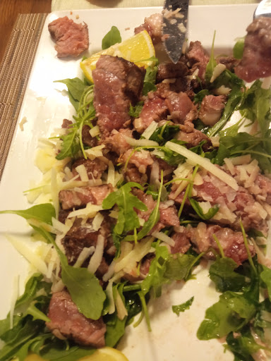 La bistecca está escrito con contorno pero no especifican qué contorno de los 4 que hay escritos en el menú. Luego le hemos preguntado si la tagliata di manzo se puede hacer sin rucola ni grana padano y el camarero responde qué para eso mejor pedir la bistecca y le hemos dado a entender que no es lo mismo una bistecca y una tagliata, a lo que él responde medio riendo y muy borde qué si, qué es lo mismo.