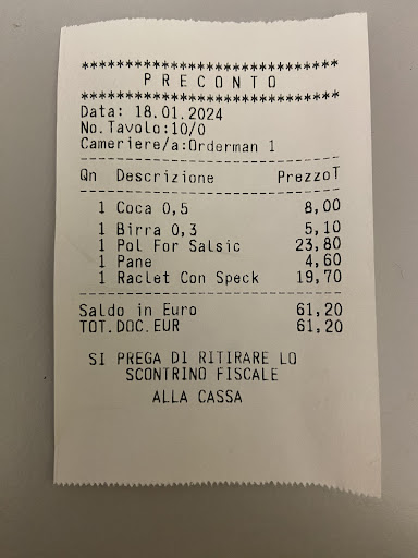 Read moreNon posso fare altro che confermare tutte le recensioni negative che si leggono (se solo le avessi viste prima…). Sono stato accolto da un cameriere piuttosto scorbutico che faceva il finto simpatico. Chiedendo se facessero dei semplici panini mi è stato detto che potevano portarmi del pane con la salsiccia a parte e quando ho chiesto se fosse possibile aggiungere qualche verdura sono stato trattato male, come se avessi chiesto qualcosa di strano ma in realtà il cameriere non aveva capito la domanda.. quindi già qui partiamo male. Ripetendo la domanda mi sono state proposte delle patate con formaggio e speck e quindi ho cambiato la mia ordinazione per quello aggiungendo anche dei crauti (sempre proposti dal cameriere), il tutto con quest’ultimo che faceva pressione non si sa per quale motivo perché ci saranno state si e no 15 persone a mangiare (ed erano almeno 3 camerieri). Ma lui aveva talmente tanta fretta che ho dovuto ordinare senza avere un menù con i prezzi davanti e prima che riuscissi a sedermi al tavolo! Alla fine mi hanno fatto pagare in anticipo una cifra esorbitante (44€). Il tutto perché mi hanno aggiunto anche la salsiccia, portata che avevo poi cambiato ma mi hanno portato comunque. In sè il cibo non era male, salsiccia a parte che era insapore e probabilmente era già tutto pronto perché mi è arrivato tutto dopo nemmeno 3 minuti dall’ordinazione. In sintesi, prezzi stellari per cibo mediocre e per un servizio pessimo (vorrei dare altri aggettivi ma non è la piattaforma appropriata). Ci sono tantissime altre alternative sicuramente più oneste, cordiali e con cibo migliore. Quindi vi consiglio di sceglierne un’altra totalmente a caso perché sarà sicuramente migliore di questa. E vedo anche molti commenti di altri clienti che sostengono la mia tesi,...