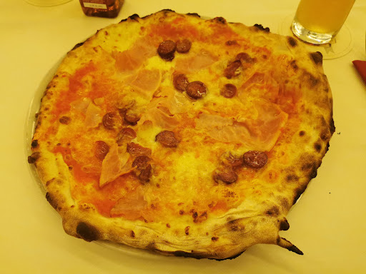 Eravamo in un paese vicino, e avevamo voglia di pizza e siamo venuti qui, io e la mia compagna. La pizzeria è collocata in un paese sulla strada, passando in mezzo a campi e campi di mais. Il parcheggio fuori è un po' limitato, infatti si parcheggia per strada. Ci fanno accomodare. Il locale ha l'aria di una tipica locanda in stile tedesco, con arredi in legno, panche e colori. La cameriera molto disponibile, ci fa accomodare in sala, in un tavolo vicino al pizzaiolo e poco distante dalla finestra. Se vi capita, chiedete di mangiare sul terrazzo perché ha una bellissima vista. Abbiamo ordinato birra e pizza. Qui, da queste parti, non hanno la salsiccia classica dolce che abbiamo noi un po' dappertutto, ma usano la salsiccia affumicata. Devo dire che la pizza si presentava molto buona e gustosa ed il prezzo era giusto per quello che abbiamo mangiato. Sicuramente è un posto da tenere d'occhio perché si sa difendere in fatto di...