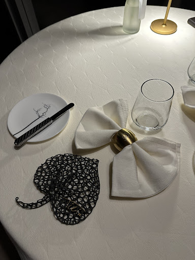 Finalmente, siamo stati condotti a un grande tavolo rotondo, adornato da una statuetta che richiama alla mente le opere di Botero, e dotato di una mise en place minimalista e di classe. Un doveroso accenno va alle poltrone, che, pur ampiamente comode, inducevano a una postura più da divano che da tavola, oltre a provocare una fatidiosa sudorazione alle gambe.