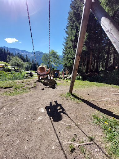 Bizat Hütte, I think this hütte is special in, that you see various funny and interesting attractions on the way, not just for children! :-) For example, a spinning throne made of wood, from which you can take a nice photo with the mountains in the background, :-) bear caves to climb through, carved wooden bears, you will see a mini chapel, and so on, ... we had a good capuchino and the staff was very nice too. You can go through St. Johann (most of the attractions too see), but also from Steinhaus. Through the forest walking or by normal road - with bicycle ride. Keeps...