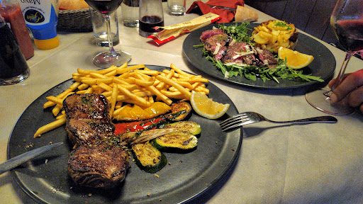 Quick service, the waiter was very attentive, he always made sure everyone had everything they needed. We had plenty of Ketchup and the interior design was rustic/authentic. The portion size was very generous, we were full afterwards. There is a decent selection for vegetarians and a small salad bar. I am deducting a star because the bill was approximately 5 Euros higher than what the prices were and we were not given a receipt, so we couldn't identify why it was more expensive (and we paid cash). I think that's a bit intransparent/on the verge of dishonest (and we gave a tip in...