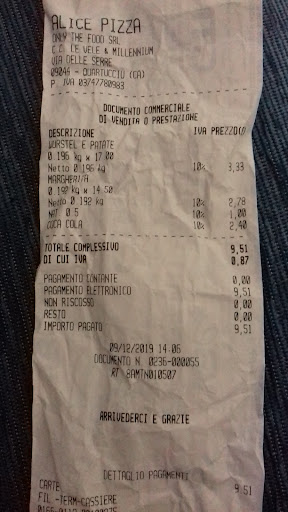 Read moreIo e il mio compagno siamo venuti a mangiare da Alice parecchie volte ed è sempre andato tutto bene, cibo ottimo.. oggi c'era una ragazza che probabilmente non era molto contenta di stare lì. Arrivati alle 20.40 ci viene detto che non possiamo sederci al tavolo.. capiamo subito e non c'è nessun problema, prendiamo d'asporto.. ci viene poi detto che dovevamo per forza pagare con carta perché la cassa era già stata chiusa, con altre persone ancora sedute a mangiare.. ok, va bene anche qui nessun problema.. scegliamo la pizza, chiedo un pezzo piccolo di una patate al forno e bacon, mi dice che sono pezzi standard e che non posso farlo più piccolo.. va bene, mette tutto nel cartone e a quel punto chiediamo che ci vengano almeno scaldate, con un espressione disturbata nel viso ci dice che aveva già spento il forno, che poteva provarci.. scusatemi, lavoro nella ristorazione anch'io, e anche il mio compagno.. capisco la voglia di andare via, capisco la fretta, le cose da fare.. ma io nel mio lavoro non mi sono mai permessa di dare ad un cliente una pietanza fredda perché avevo spento 20 minuti prima della chiusura. Ringraziamo e...
