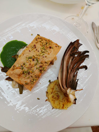 Read moreSplendida cena di S. Valentino con menù dedicato con la mia compagna. Siamo stati accolti calorosamente dal proprietario che ci ha fatti accomodare al tavolo a noi riservato che già si presentava con una bella bottiglia di prosecco DOC Extra Dry nel cestello del ghiaccio. Poco dopo ci è stato servito un entree di benvenuto:delle mini croissant salate di pasta sfoglia con ripieno al pesce spada affumicato. Si proseguiva con un'ottimo bis di antipasti in sequenza: Calamaro ripieno di radicchio di Treviso con vellutata di carote e zenzero prima e Code di mazzancolle al lime con spaghettini di zucchine e porro croccante poi. Dopo una breve pausa ci veniva servito il primo, dei deliziosi raviolotti ripieni di burrata con salsa all'astice. Tra un sorso di vino e una chiacchiera romantica gustavamo poi come seconda portata una millefoglie di branzino, carciofi e cialda alla granella di pistacchio, con contorno di cremina di spinaci, tortino di patate arrosto e radicchio spadone al grigliato. Concludevamo in bellezza con una sfoglia alla crema chantilly con coulisse di fragole, accompagnata da un calice di Moscato. Servizio e qualità del cibo davvero ottimi e prezzo in linea,anzi leggermente inferiore, con le proposte dei vari ristoranti di pari livello. Per me è stata un'ottima esperienza e sicuramente ci ritornerò anche in...