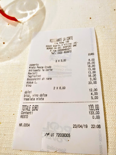 Il Ristorante La Corte è il ristorante dell’Hotel Ca’ Borgo dei Sospiri (che tra l’altro è molto carino, accogliente e con un buon rapporto qualità prezzo per la sua categoria) ma va considerato a se stante (come succede spesso in casi come questo dove il Ristorante assume una sua importanza e si ritaglia un suo spazio preciso).. La sala è piacevole soprattutto per la parte della veranda (se possibile chiedere un tavolo in quella zona) ed il menu interessante con proposte che traggono ispirazione dal territorio. Abbiamo mangiato: un antipasto di crudi, con materie prime incredibilmente fresche ed un antipasto La Corte che è molto piacevole perché propone sei prodotti del mare “bolliti” con differenti cotture e preparazioni. Poi abbiamo mangiato degli ottimi tagliolini ai calamaretti e pomodori pachino confit e dei ravioli ripieni di branzino su letto di crema di ortiche (i ravioli, dall’impasto al ripieno erano molto buoni mentre non sono rimasto del tutto convinto della crema di ortiche…). Come secondo abbiamo diviso dei trancetti di coda di rospo con salsa alla yogurt interessante ma la cottura del pesce non è perfettamente riuscita. Per finire abbiamo concluso con un ottimo tortino di cioccolato (che non stanca mai) proposta con del gelato alla vaniglia con crumble di cioccolato, un buono stick di cioccolato e una gelatina di passion fruit e un semifreddo al pistacchio ripieno di passion fruit, un po’ da rivedere. Discreta la lista dei vini; abbiamo bevuto il Conegliano Valdobbiadene Bepin De Eto molto piacevole. Servizio ineccepibile. In conclusione quindi: il ristorante La Corte è un posto buono e piacevole che può meritare la visita se per un qualche motivo ci si trova nella...