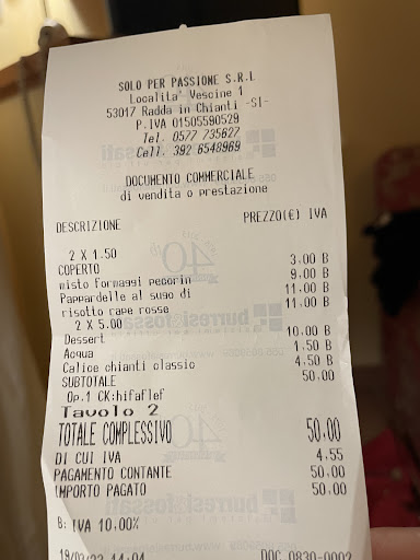 When the check arrived, we were both shocked at how low the cost of the meal was. Just over 100 Euros for a 3 course dinner meal for 2 with LOTS of wine. And we even got a pizza to go!