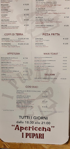 V E R G O G N O S O!!!!!!!!!! Sono costretto a dare una stella perché purtroppo di meno non se ne possono dare! A primo impatto il locale si presenta molto carino, decidiamo di accomodarci, avendo letto anche molte recensioni positive. Ma ancora mi domando cosa abbiano trovato di positivo in ciò che offre “I Pupari”... Propone un menù abbastanza variegato. Abbiamo preso gli arancinetti misti di mare, praticamente riso bollito che sapeva di limone, non ci ho trovato né la diversità tra l’uno e l’altro né tantomeno il “mare”. Dopodiché abbiamo preso la cassetta mix di pesce: gran fritto misto, gamberi in tempura, lecca lecca di sarde, patatine, panelle e crocchette. Io non so dove si trova il coraggio di presentare un piatto del genere, il pesce fritto era NERO, le sarde e i gamberi avevano un sapore disgustoso, le panelle sapevano solo di olio, le crocchette erano le classiche crocchette surgelate che si trovano al supermercato, salvo solo le patatine. Ovviamente abbiamo preso e ce ne siamo andati, lasciando tutto nei piatti, volevamo evitare un’intossicazione alimentare. Inoltre abbiamo preso da bere una coca cola e una gazzosa, il tutto per la bellezza di 40€, ah e si fanno pagare anche il 10% di servizio oltre al coperto. Se ci tenete alla vostra salute...