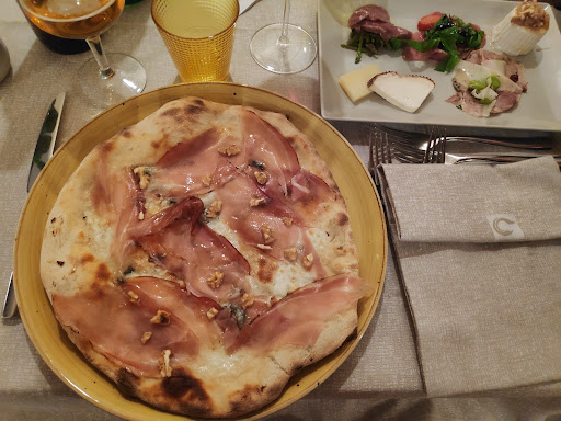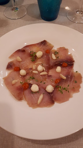 It was difficult to find; doubling back down a farm track behind a garage. So the imposing courtyard and double height interior was a surprise. We arrived early by Italian standards (7:30) but were welcomed and given two generous tasty bites while we considered the menus. Our prima piatti of risotto and spaghetti carbonara were delightful, and the main courses of fish and pork fillet were enough to complete our meal. The main thing that put me off was the ambient music which was stuck in the middle of a track with a guy doing rap, then a snatch of melody, then back to the rap. It went on in a loop, but was obviously too quiet for the busy staff to notice. As I do not like rap I was not...